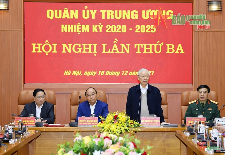 Tổng Bí thư Nguyễn Phú Trọng, Bí thư Quân ủy Trung ương chủ trì Hội nghị Quân ủy Trung ương lần thứ ba, nhiệm kỳ 2020-2025 tổng kết công tác quân sự, quốc phòng năm 2021, xác định phương hướng lãnh đạo thực hiện nhiệm vụ quân sự, quốc phòng và xây dựng Đảng bộ Quân đội năm 2022.