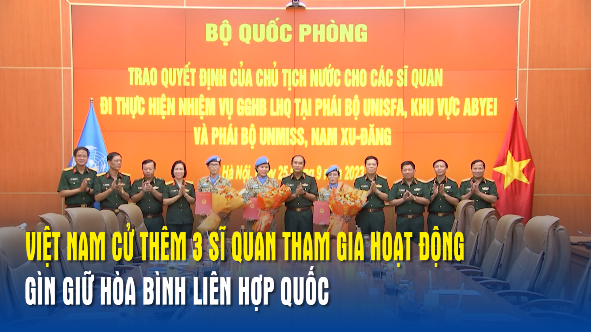 Thượng tướng Phùng Sĩ Tấn, Phó tổng Tham mưu trưởng Quân đội nhân dân Việt Nam chủ trì buổi lễ trao Quyết định của Chủ tịch nước cho 3 sĩ quan chuẩn bị triển khai làm nhiệm vụ tại các phái bộ ở khu vực Abyei và Nam Sudan.