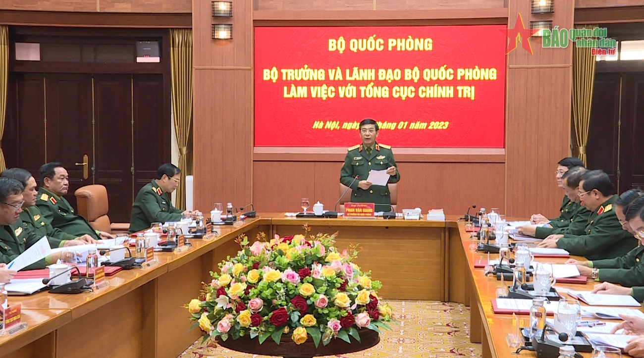 Chiều 31-1, tại Hà Nội, Đại tướng Phan Văn Giang, Ủy viên Bộ Chính trị, Phó bí thư Quân ủy Trung ương, Bộ trưởng Bộ Quốc phòng chủ trì buổi làm việc với Tổng cục Chính trị Quân đội nhân dân Việt Nam về kết quả công tác năm 2022 và triển khai các nhiệm vụ chính trị trọng tâm năm 2023.