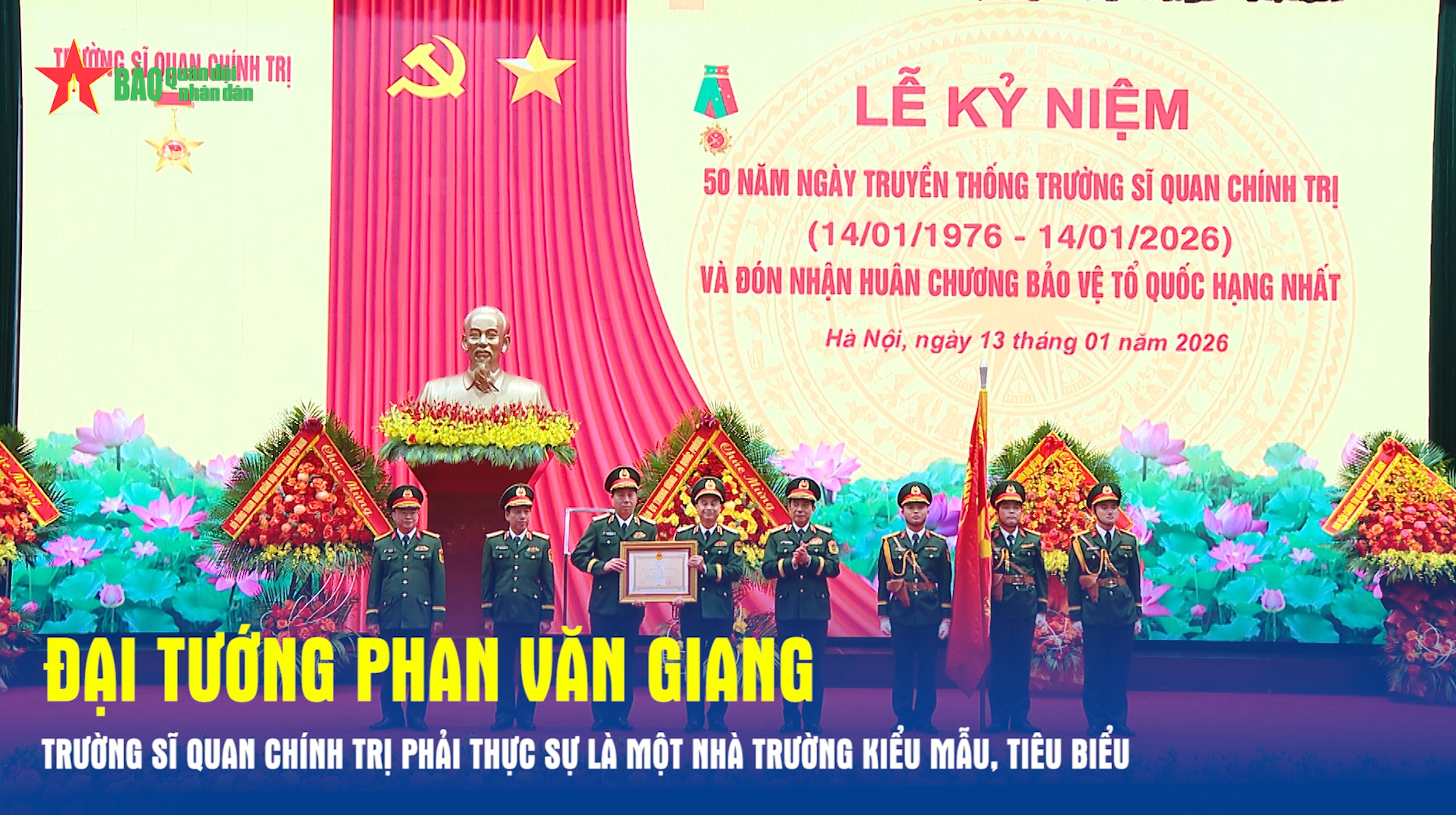 Sáng 13-1, Trường Sĩ quan Chính trị long trọng tổ chức Lễ kỷ niệm 50 năm Ngày truyền thống và đón nhận Huân chương Bảo vệ Tổ quốc hạng Nhất. Đại tướng Phan Văn Giang, Ủy viên Bộ Chính trị, Phó bí thư Quân ủy Trung ương, Bộ trưởng Bộ Quốc phòng dự, chỉ đạo buổi lễ.