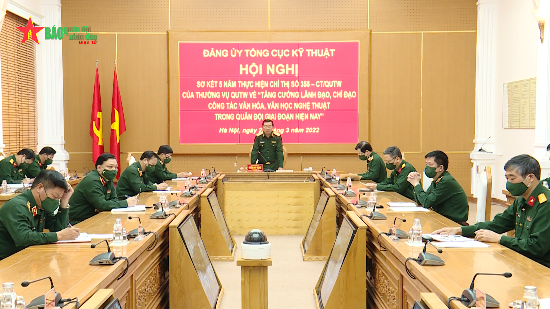 Sáng 23-3 tại Hà Nội, Đảng uỷ Tổng cục Kỹ thuật đã tổ chức Hội nghị sơ kết 5 năm thực hiện chỉ thị số 355 của Thường vụ Quân uỷ Trung ương về “Tăng cường lãnh đạo, chỉ đạo công tác văn hoá, văn học nghệ thuật trong giai đoạn hiện nay” theo hình thức trực tuyến.