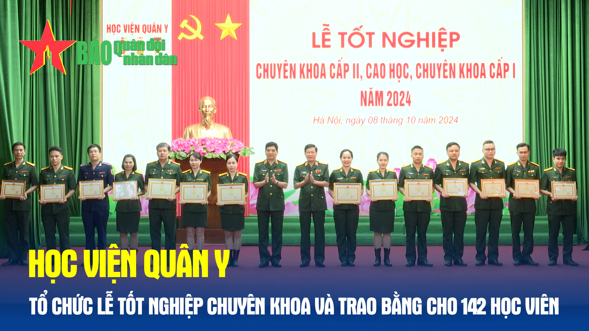 Chiều 8-10, tại Hà Nội, Học viện Quân y tổ chức lễ tốt nghiệp và trao bằng cho 142 học viên tốt nghiệp các khóa đào tạo trình độ thạc sĩ, bác sĩ chuyên khoa cấp I và chuyên khoa cấp II năm 2024.