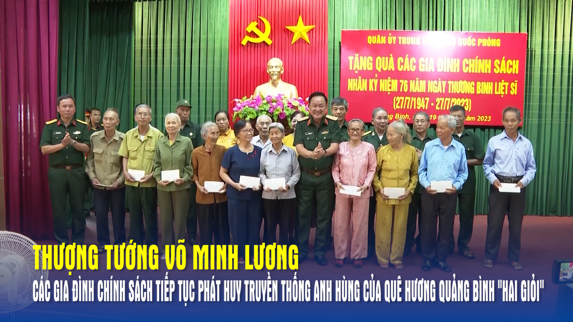 Thượng tướng Võ Minh Lương đã trao 20 suất quà của Quân ủy Trung ương, Bộ Quốc phòng tặng các gia đình chính sách trên địa bàn tỉnh Quảng Bình. Giá trị những suất quà tuy không lớn nhưng thể hiện tình cảm, trách nhiệm, sự quan tâm, động viên kịp thời, tri ân sâu sắc của Quân ủy Trung ương, Bộ Quốc phòng, cán bộ, chiến sĩ toàn quân đối với người co công với cách mạng.