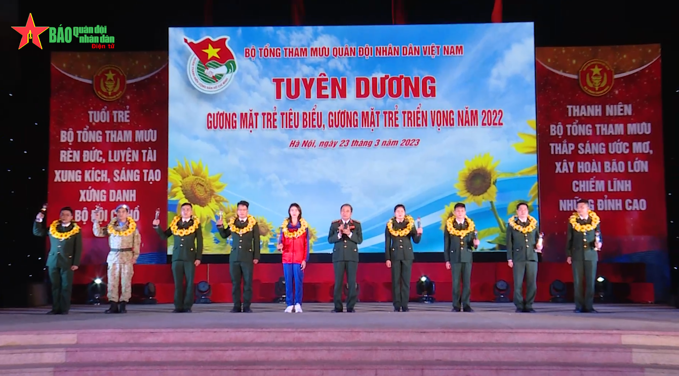Tối 23-3, Bộ Tổng Tham mưu QĐNDViệt Nam tổ chức tuyên dương Gương mặt trẻ tiêu biểu, Gương mặt trẻ triển vọng năm 2022; cá nhân đạt Giải thưởng “Tuổi trẻ sáng tạo trong Quân đội” lần thứ 22
