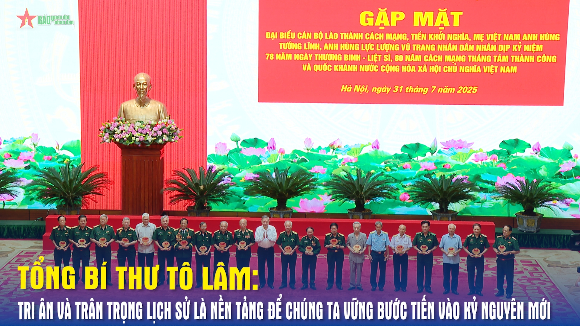 Sáng 31-7, tại Hà Nội, Tổng Bí thư Tô Lâm, Bí thư Quân ủy Trung ương gặp mặt đại biểu cán bộ lão thành cách mạng, tiền khởi nghĩa, Bà mẹ Việt Nam anh hùng, tướng lĩnh, Anh hùng Lực lượng vũ trang nhân dân, nhân dịp kỷ niệm 78 năm Ngày Thương binh-Liệt sĩ, 80 năm Cách mạng Tháng Tám thành công và Quốc khánh nước Cộng hòa xã hội chủ nghĩa Việt Nam.